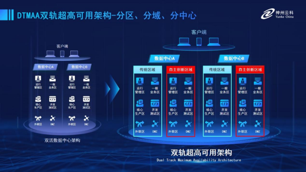 推出了双轨超高可用架构。该架构在双活数据中心的分区调度基础上,增加信创域和非信创域的分域调度,实行信创域与传统域应用全量部署,使双中心运营变为双中心四区域并行运行,互为多活,将“0到1”的单轨建设道路变为分区分域协同的多活双轨超高可用架构。帮助客户在新架构下,保障“信创”的同时解决性能瓶颈,提升稳定性,保证应用可持续性,最终实现信创区域和非信创区域的平滑过渡,完成国产化替代目标。