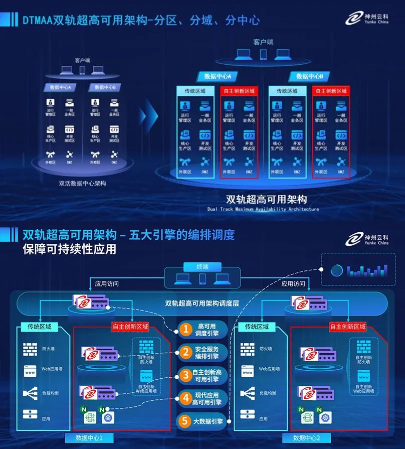 为助力银行业务高质量发展,更好地应对数字经济时代对可持续性的高要求,实现“信创”与“数字化”齐头并进,开云篮球-开云(中国) 创新性的推出了双轨超高可用架构。该架构在双活数据中心的分区调度基础上,增加信创域和非信创域的分域调度,实行信创域与传统域应用全量部署,使双中心运营变为双中心四区域并行运行,互为多活,将“0到1”的单轨建设道路变为分区分域协同的多活双轨超高可用架构。帮助客户在新架构下,保障“信创”的同时解决性能瓶颈,提升稳定性,保证应用可持续性,最终实现信创区域和非信创区域的平滑过渡,完成国产化替代目标。