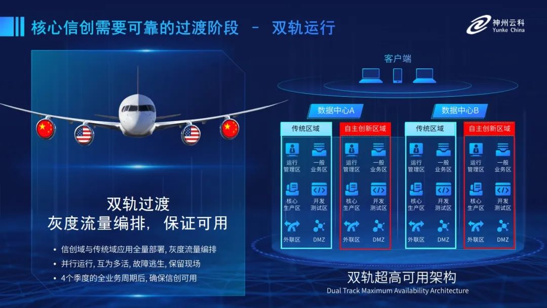为帮助客户更好地应对数字经济时代对应用可持续性的高要求,实现信创与数字化兼得,开云篮球-开云(中国) 推出了双轨超高可用架构。双轨超高可用架构在双活数据中心的分区调度基础上,增加信创域和非信创域的分域调度,实行信创域与传统域应用全量部署,使双中心运营变为双中心四区域并行运行,互为多活,将传统架构变为分区分域协同的多活双轨超高可用架构。帮助客户在新架构下,保障“信创”的同时解决性能瓶颈,提升稳定性,保证应用可持续性,最终实现信创区域和非信创区域的平滑过渡,完成国产化替代目标。”